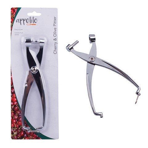 The Appetite Cherry and Olive Pitter removes the pit or stone from small, round fruits with ease, while leaving the fruit whole and intact. The ergonomic arms are specially designed to cause no hand fatigue and make it easy to use.