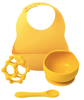 - Comes with scoop bib to catch food, suction-base bowl to avoid spills, curved easy-to-hold spoon and tactile teething toy!