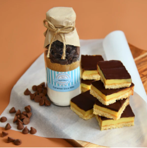 Containing all our Signature dry ingredient Mix Base, topped with real Nestle Dark Choc Bits and dressed in our Signature label, Kraft paper topper, jute twine and an instructional swing tag (containing - ingredients, allergens, nutritional information and most importantly how to bake method!).